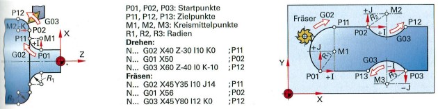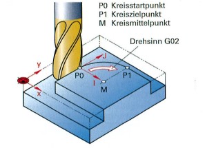 - Kierunek obrotów G02 zgodnie z ruchem wskazówek zegara lub G03 przeciwnie do ruchu wskazówek zegara
